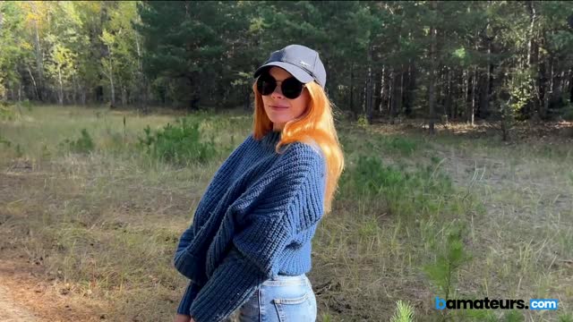 Ginger babe swallows cock in the woods